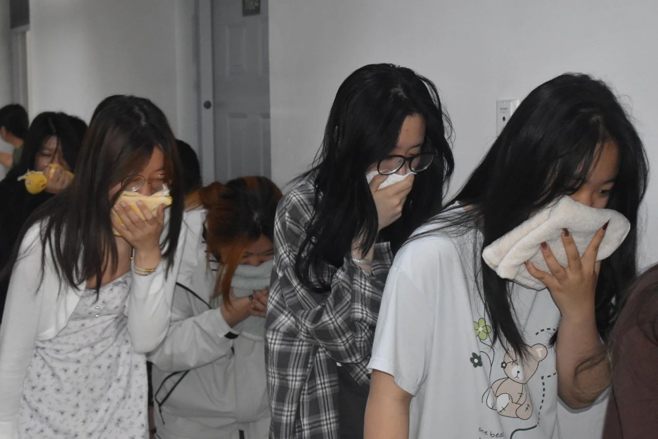 谢华老师采取“理论+实践”相结合的方式,通过讲解、案例分析、模拟演练等形式,系统介绍了火灾预防、初期火灾扑救、疏散逃生等关键技能。演练环节模拟真实火情,组织师生有序撤离。并现场演示灭火器,邀请同学实际操作,强化“一提、二拔、三握、四压”的灭火技巧,真正做到“学以致用”。